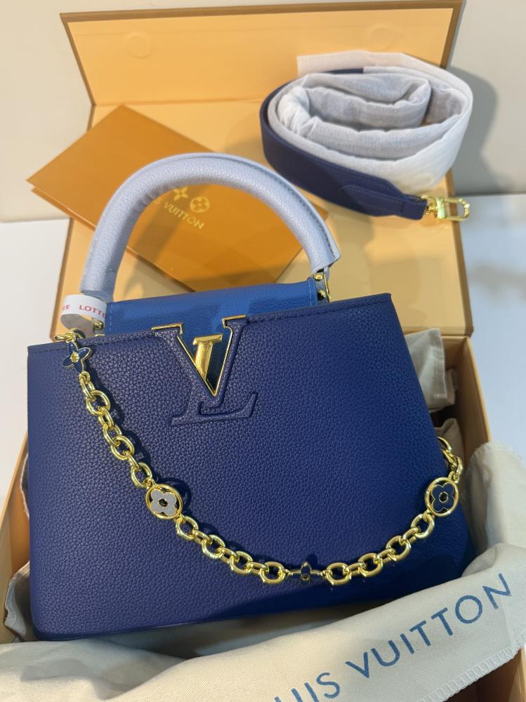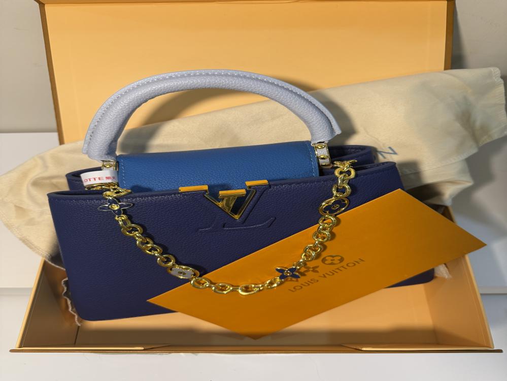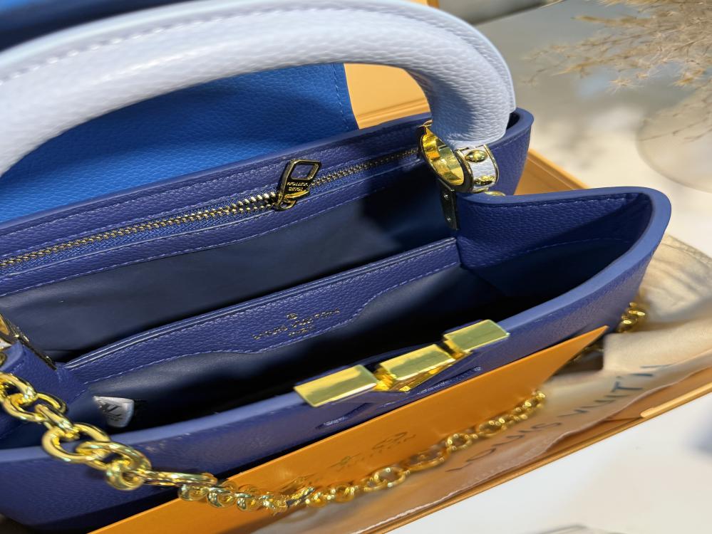 أضيفي لمسة من الفخامة إلى إطلالتك مع هذه الشنطة الساحرة من Louis Vuitton، المصنوعة من جلد عالي الجودة بملمس فاخر يضمن لك المتانة والأناقة في آنٍ واحد. تأتي بلون أزرق ملكي مع مقبض علوي بلون أزرق فاتح يضفي عليها لمسة عصرية، وسلسلة ذهبية أنيقة مزخرفة بتفاصيل أيقونية تزيد من فخامتها.